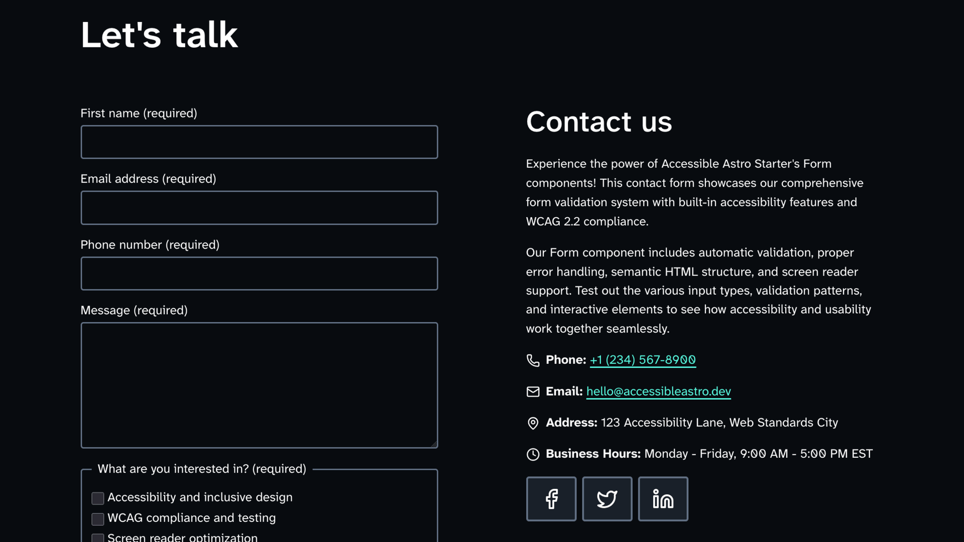 • Contact page with comprehensive form validation showcase and accessibility demonstrations