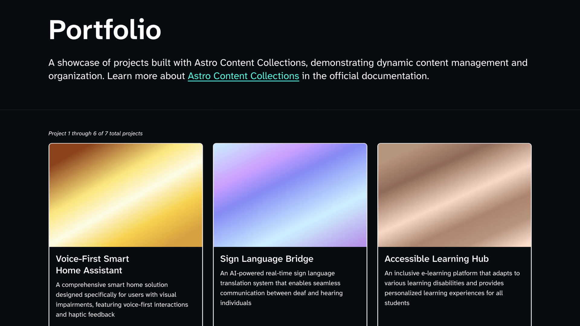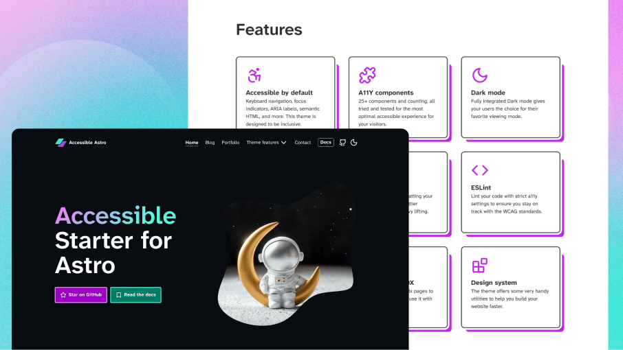 A ready-to-use, SEO and accessibility-focused Astro starter template. Built with modern web standards and WCAG guidelines in mind, it provides a solid foundation for creating inclusive websites. Features Tailwind CSS 4 integration, comprehensive component library, color contrast checker, and typography with Atkinson Hyperlegible font for improved readability. Includes dynamic blog/portfolio pages with social sharing, and full MDX support.
