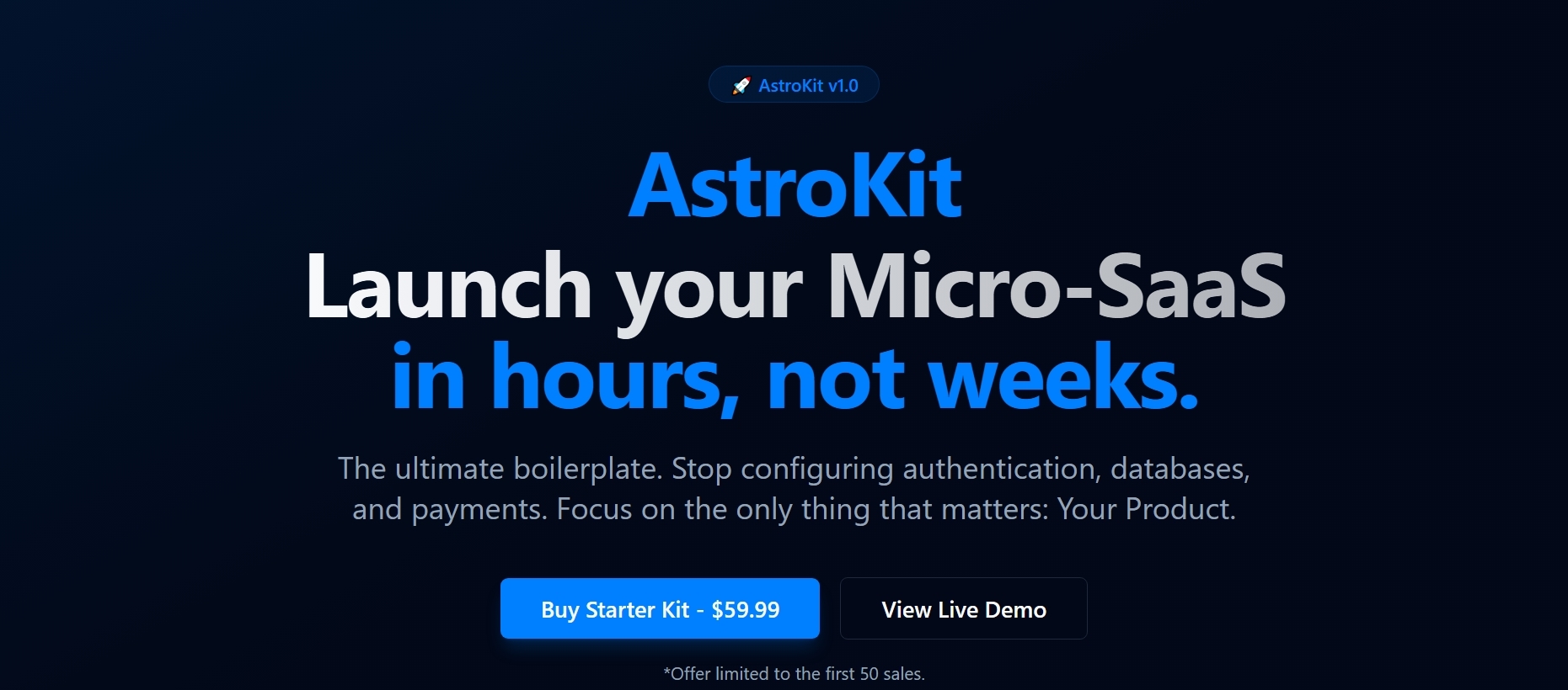 AstroKit is the ultimate boilerplate for launching your Micro-SaaS in hours, not weeks. Built with Astro 5, React 19, and Tailwind CSS v4, AstroKit eliminates the tedious setup phase and lets you focus on what matters: your product.
